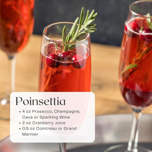 The Poinsettia cocktail is a festive holiday classic, known for its vibrant red hue that mirrors the iconic holiday flower it's named after. This elegant drink combines the crisp, tart flavors of cranberry juice with the light effervescence of champagne or sparkling wine, often with a splash of orange liqueur like Cointreau for a citrusy twist. The Poinsettia’s simplicity