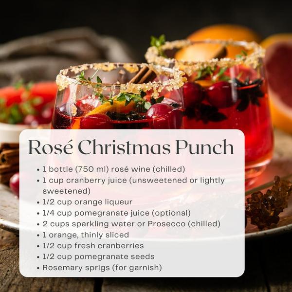 add vibrant color but also infuse the punch with festive flavors. Garnished with sprigs of rosemary or sugared cranberries, this punch is a visually stunning addition to any holiday table. Its balance of sweet, tart, and bubbly notes, along with its beautiful pink hue, makes Rosé Christmas Punch a joyful and crowd-pleasing choice for festive occasions.