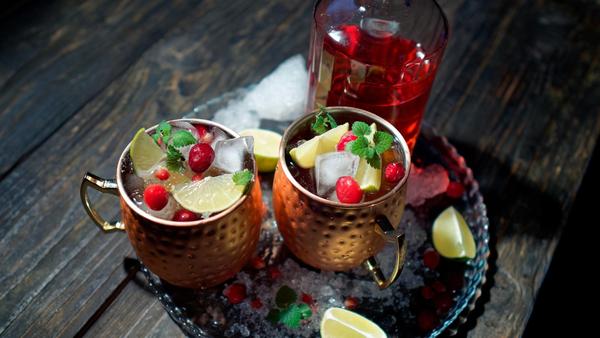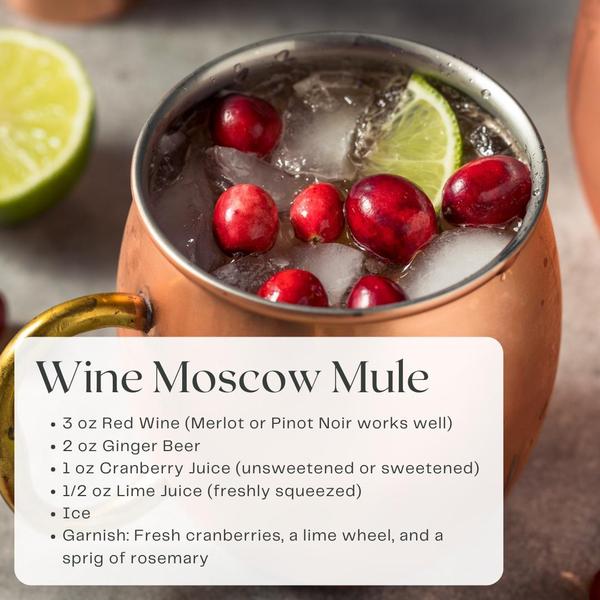 with fresh cranberries, a sprig of fragrant rosemary, and a lime wheel—makes it as visually delightful as it is delicious. Served in a signature copper mug, the Holiday Wine Moscow Mule is a show-stopping addition to any holiday table, offering a refreshing balance of cozy and celebratory vibes. A must-have for toasting with family and friends!