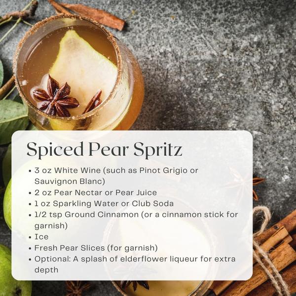 fresh pear and a cinnamon stick garnish add a visually stunning and seasonal touch. With its crisp and slightly spiced flavor profile, the Spiced Pear Spritz is a perfect drink for holiday gatherings, offering a festive and sophisticated alternative to traditional cocktails. It’s the ideal balance of bright, refreshing, and warmly spiced—just what you need to toast to the season!
